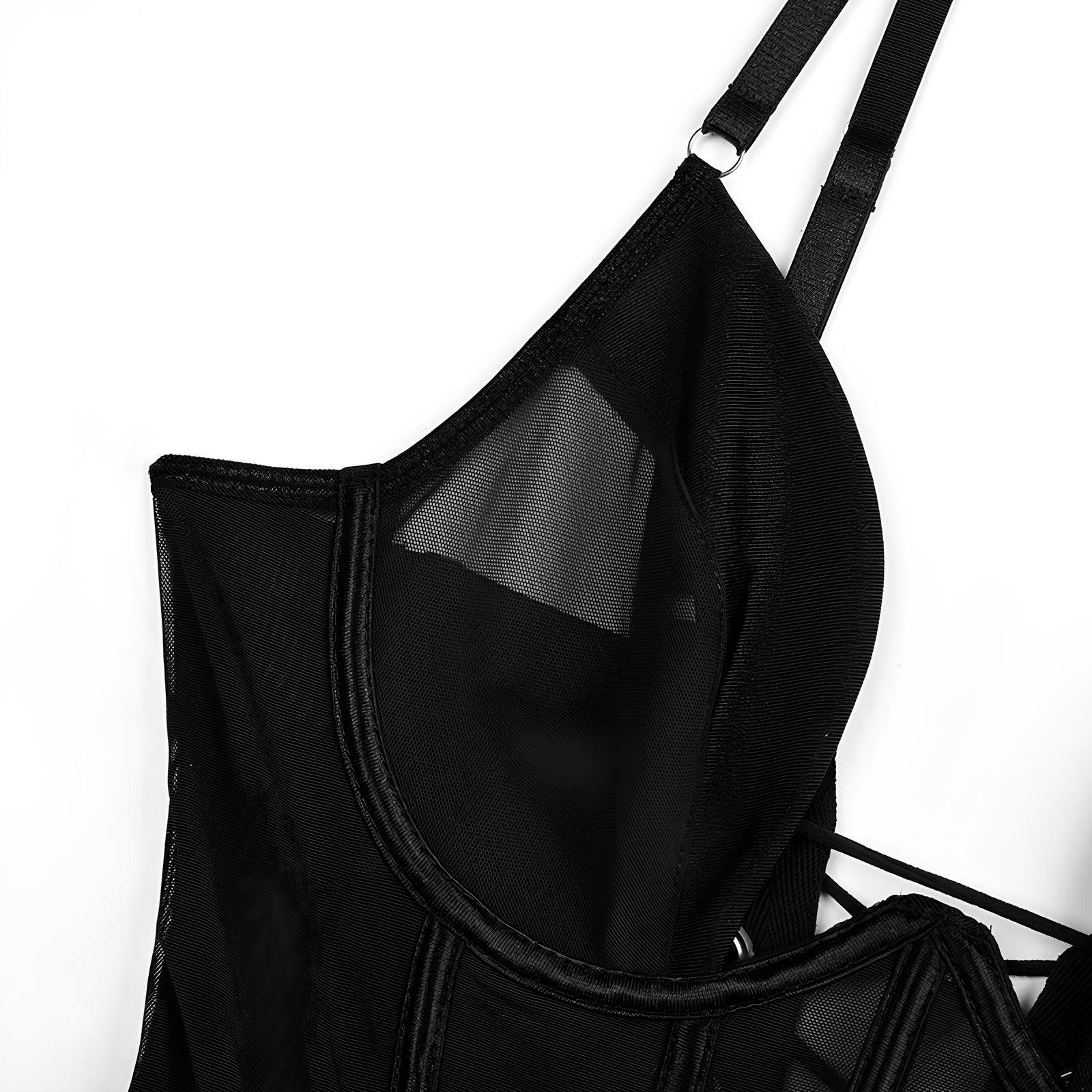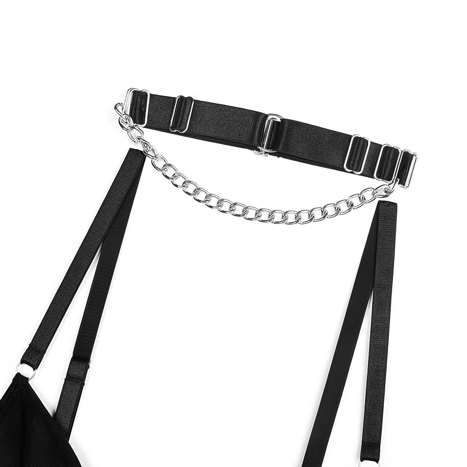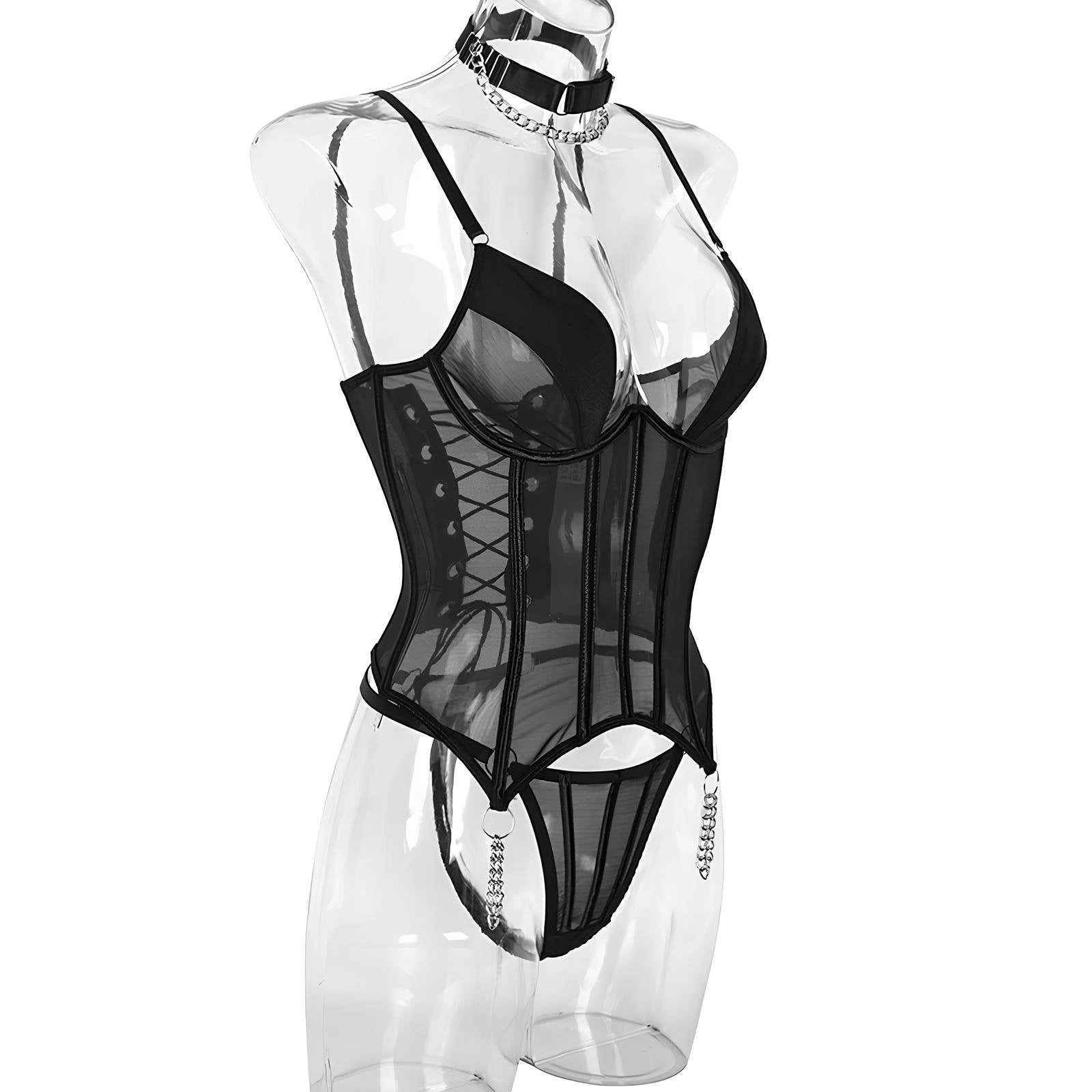 Command attention in this fierce, industrial-inspired ensemble. The structured corset bodice combines opaque cups with sheer mesh panels and vertical boning to sculpt a dramatic hourglass silhouette. A provocative lace-up back allows for a custom cinch, while the hips are accentuated by edgy silver chain hardware draping from the garter straps. Completed by a matching high-cut thong and a coordinating chain-link choker, this set strikes the perfect balance between gothic romance and heavy metal seduction.