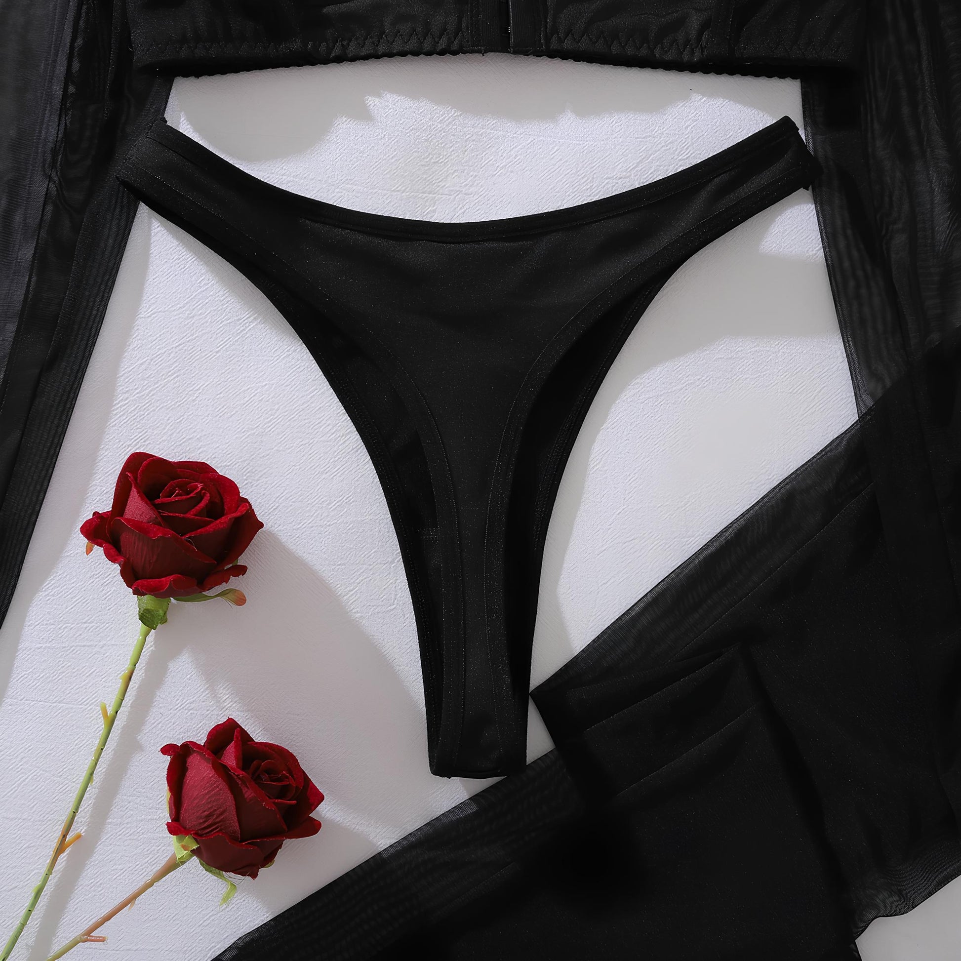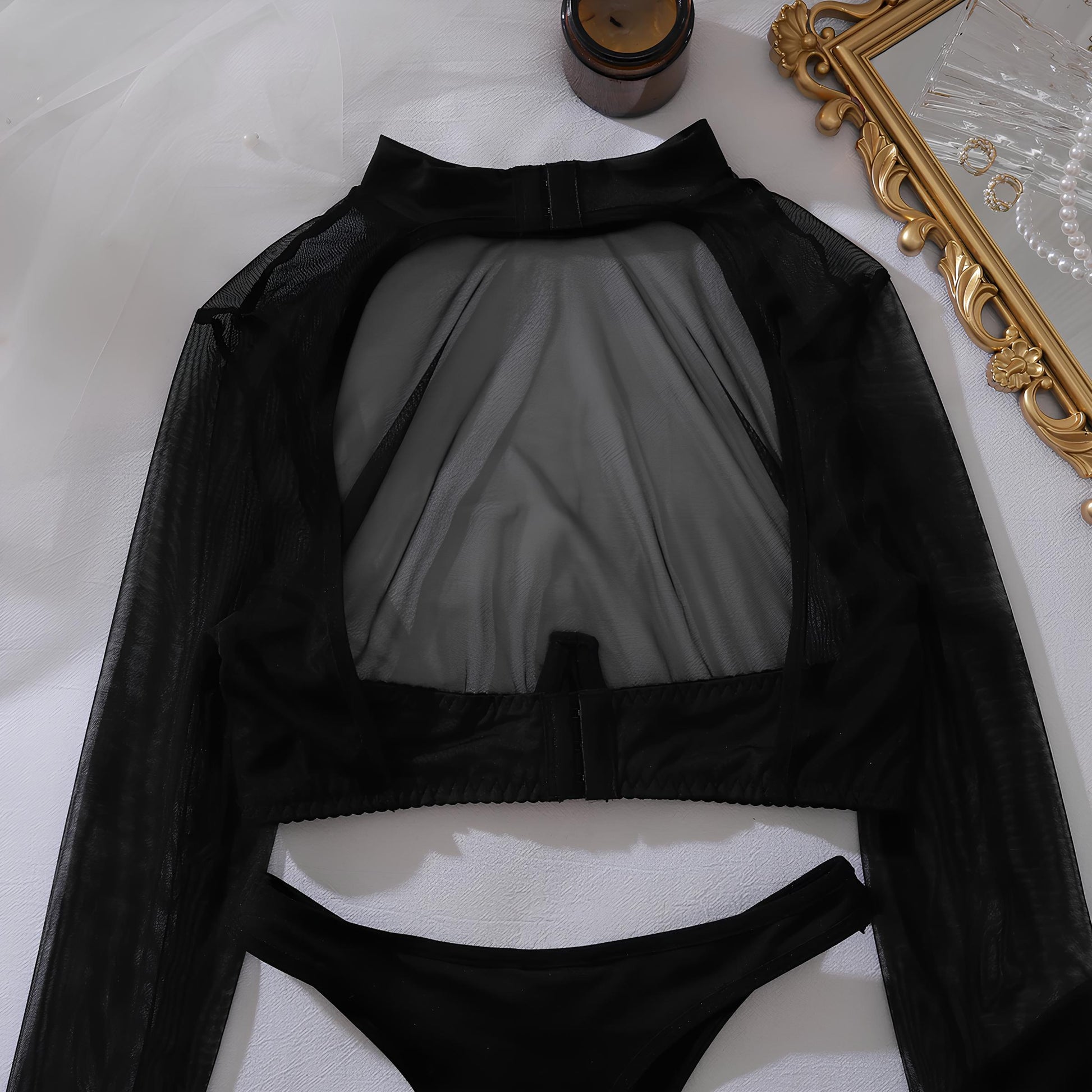 Master the art of the reveal with this sleek, architectural ensemble. The look is anchored by a sophisticated mock-neck crop top featuring sheer long sleeves and a daring open back, balanced by a structured underwire shelf bra that lifts and frames the bust. Paired with a high-cut thong to lengthen the silhouette, the set is completed by statement thigh-high stockings topped with intricate, cage-style strappy garters. It is a stunning study in contrast—covering skin while revealing everything.