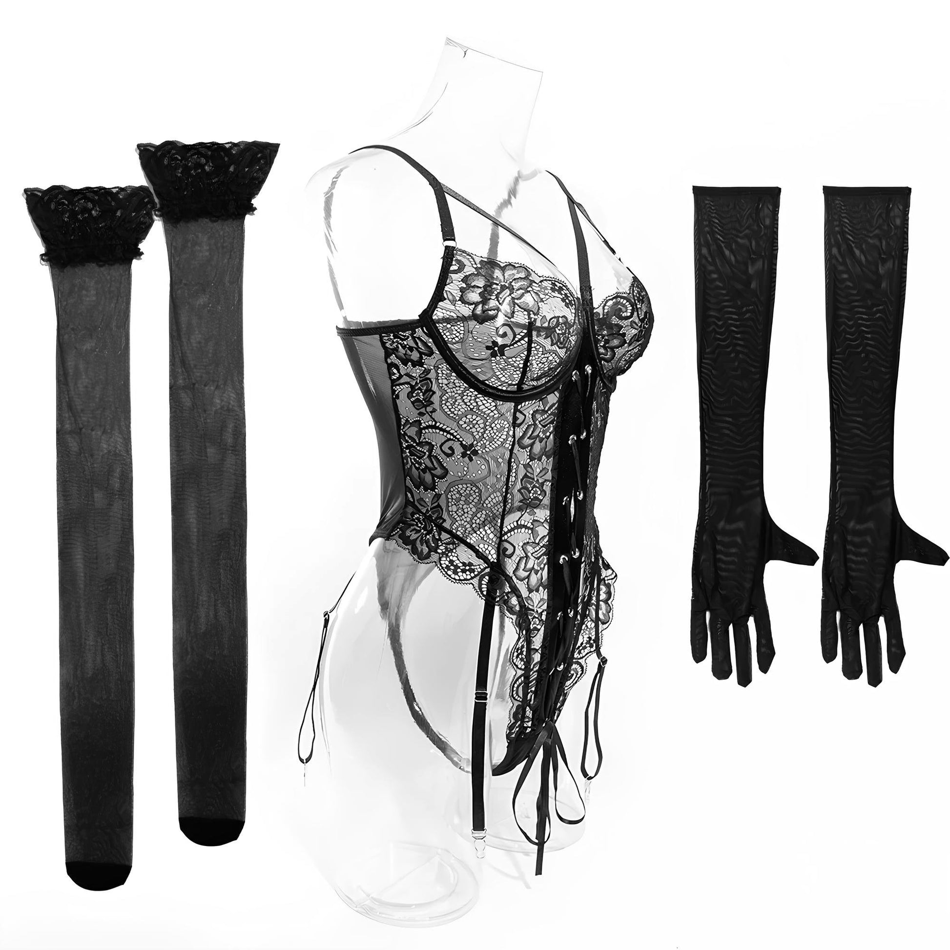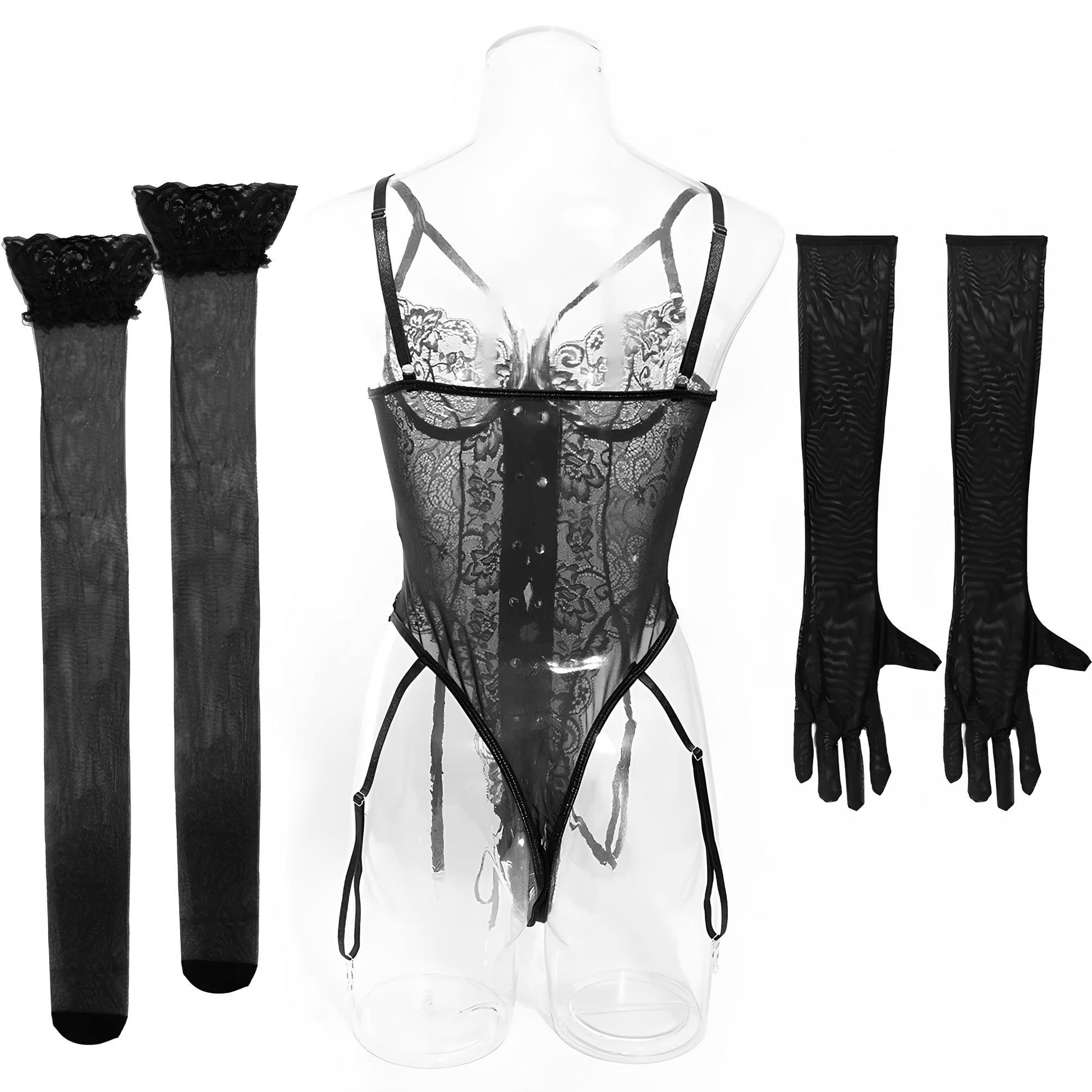 Embrace timeless seduction with this intricately detailed lace teddy. The design blends romantic Victorian aesthetics with modern edge, featuring a floral lace bodice accented by a provocative satin ribbon lace-up center. Structured underwire cups and strappy cage detailing frame the décolletage, while the high-cut leg and thong back elongate the figure. The ensemble is dramatically finished with attached adjustable garter straps, matching sheer opera gloves, and lace-top stockings, offering a complete, head-to-toe vision of dark elegance.