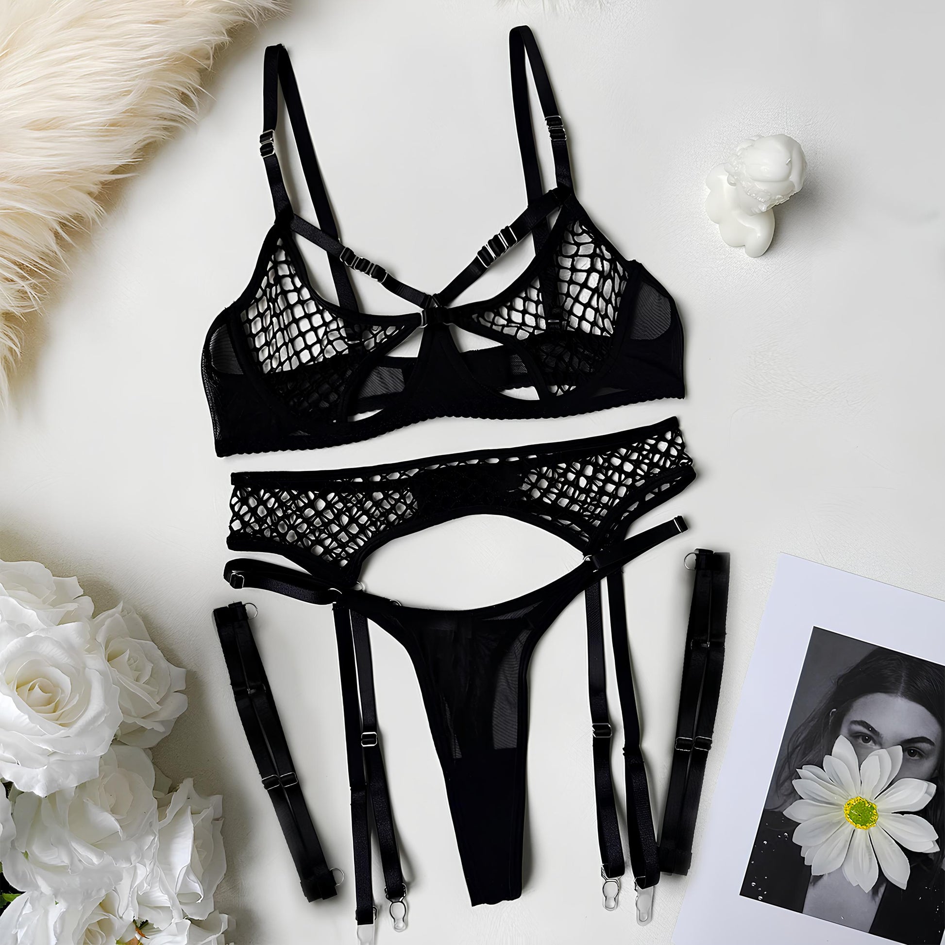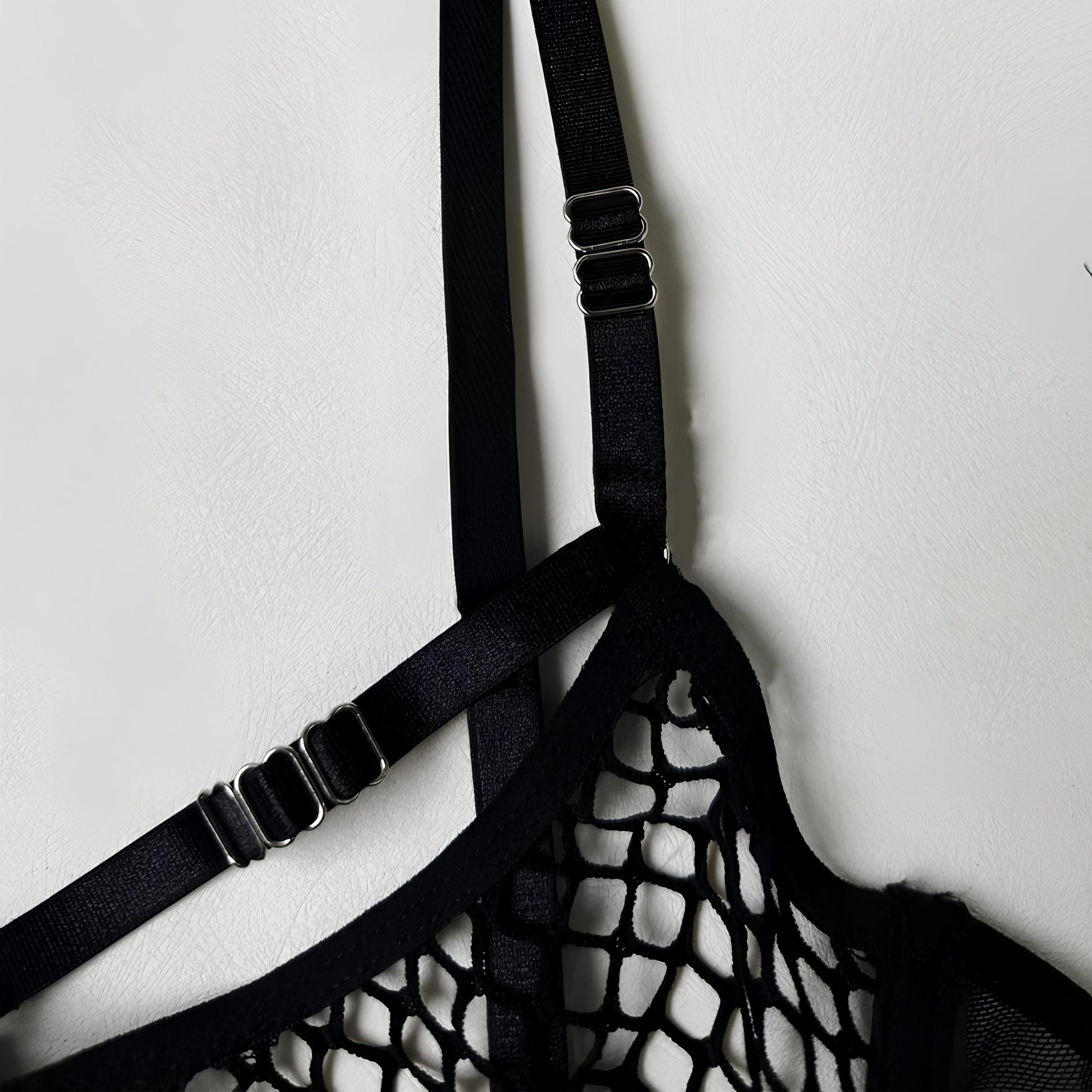Embrace a look that is both fierce and flirtatious with this daring fishnet ensemble. The cage-style bra demands attention with its wide-net mesh cups and provocative keyhole cutouts, utilizing a comfortable, wireless stretch construction to naturally frame your shape. The silhouette is anchored by a striking high-waisted mesh garter belt that effortlessly sculpts your curves, connecting to strappy thigh harnesses for a bold, bondage-inspired finish. Designed for those who aren't afraid to take control, this matched set combines edgy aesthetics with pure seductive appeal to ensure all eyes remain on you.