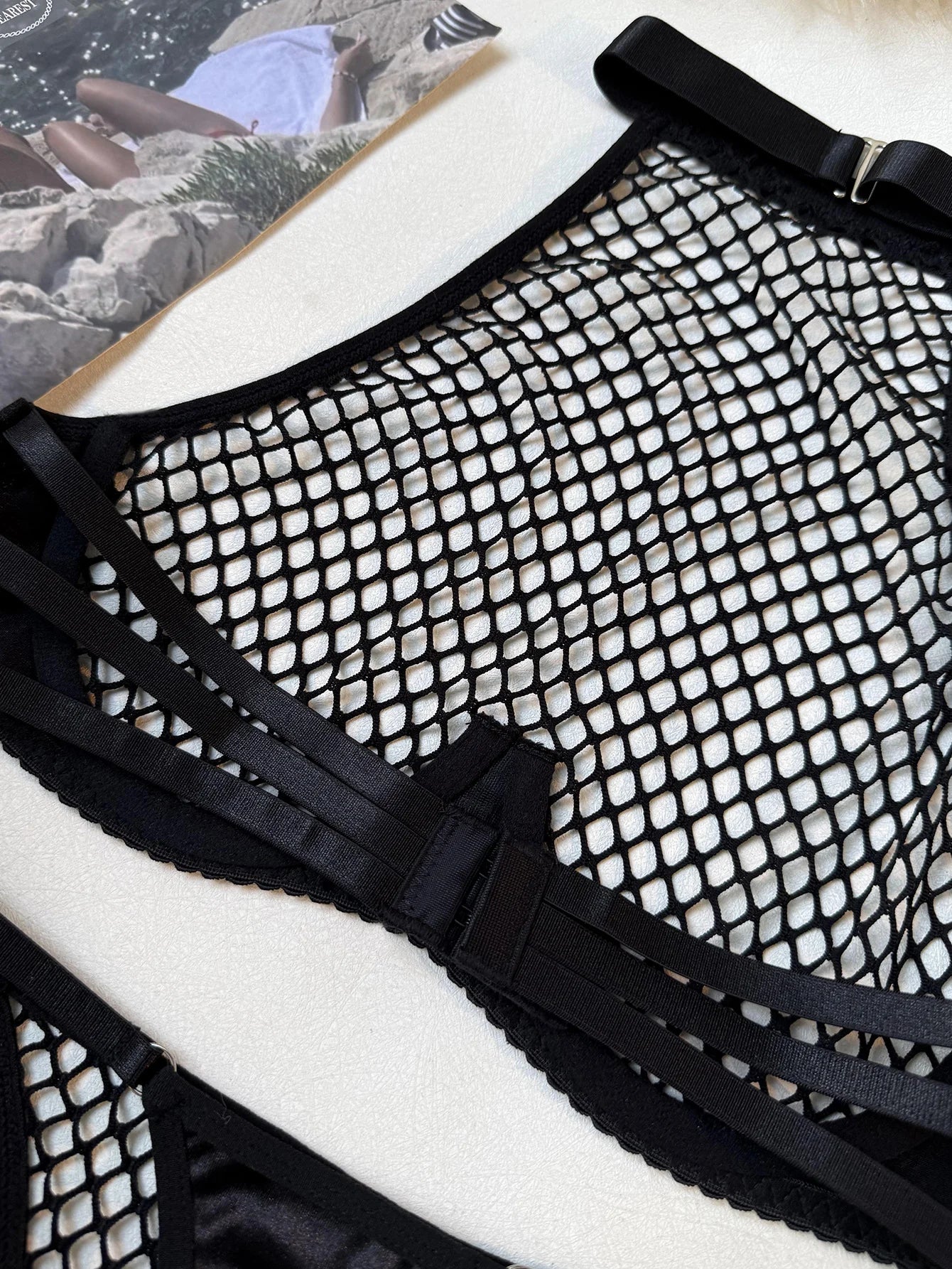 Ignite the night in this daring, rave-ready two-piece. The design centers on a commanding high-neck halter bra, featuring structured underwire support and wide-gauge mesh that leaves little to the imagination. The back reveals a sultry triple-strap closure that adds architectural detail to the bare skin. Paired with a matching high-cut G-string, the bottoms feature adjustable side sliders with silver hardware to ensure a flawless, custom fit. It is the perfect collision of edgy streetwear aesthetics and intimate seduction.