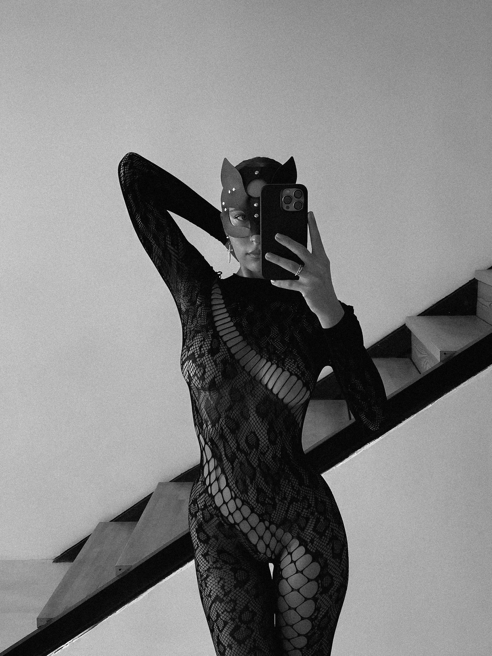 Unleash your untamed side with this fierce, open-work catsuit. Woven with a bold leopard pattern, the sheer mesh silhouette contours the body like a second skin. It balances coverage and exposure perfectly, featuring a high neckline and plunging open back, interrupted by a daring, diagonal ladder cutout that slashes across the torso for an edgy, deconstructed finish.