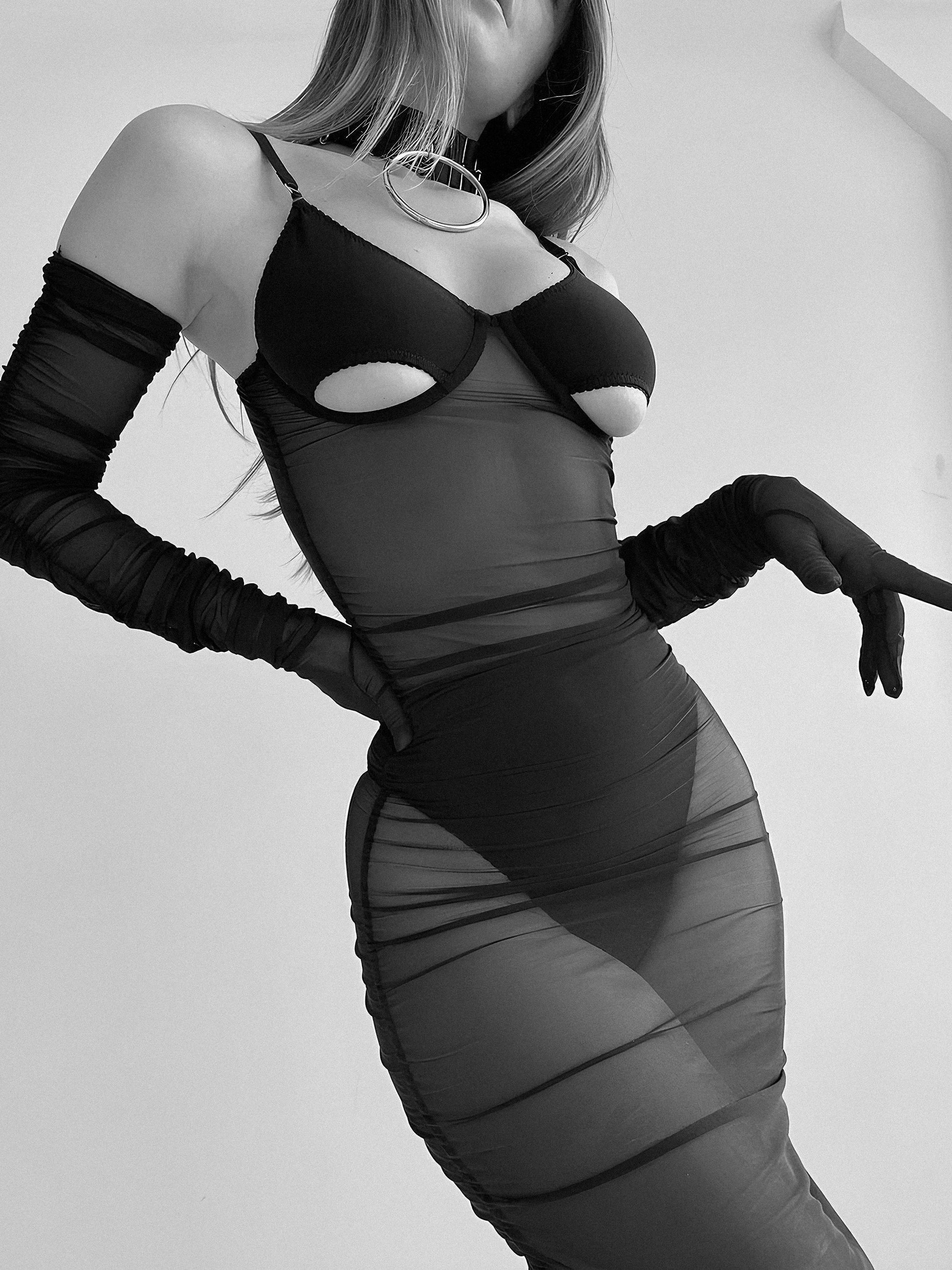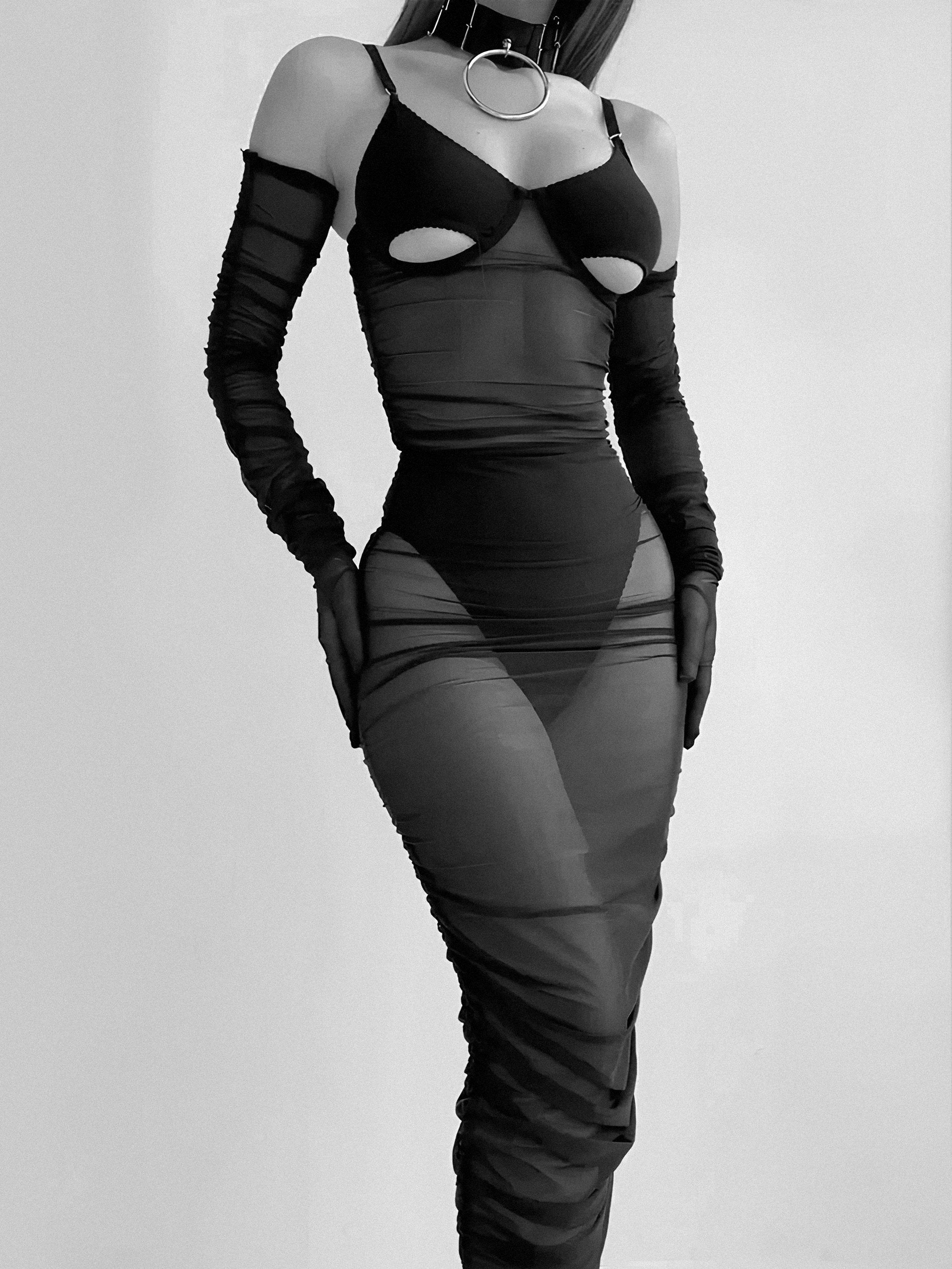 Channel your inner femme fatale with this provocative four-piece ensemble. The centerpiece is a sultry, semi-sheer midi dress featuring all-over ruching that sculpts the body, paired with underwire cups and daring peekaboo cutouts for a tease of skin. Layered over a matching high-cut panty, the look is completed by drama-inducing accessories: sheer opera-length gloves and a wide statement choker with a bold silver O-ring. It is the ultimate fusion of gothic edge and modern glamour.